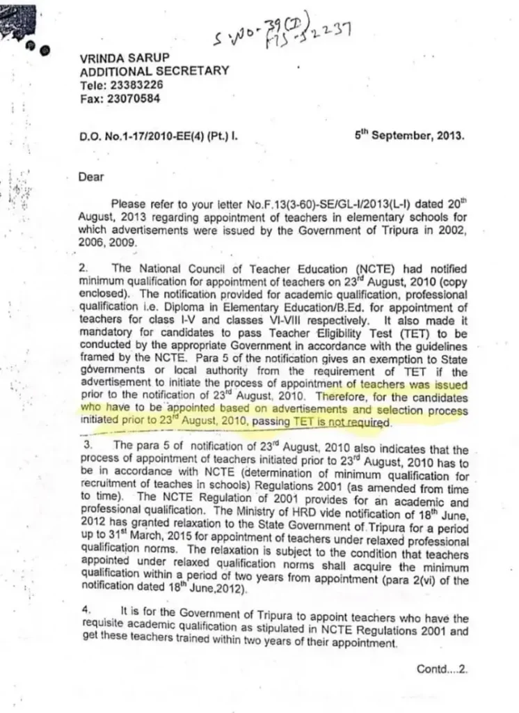सितंबर 2013 में जारी एक आधिकारिक पत्र में इस विषय को और स्पष्ट किया गया। इस पत्र में बताया गया कि किन परिस्थितियों में टीईटी अनिवार्य है और किन मामलों में छूट दी जा सकती है।